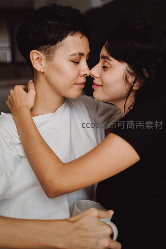 一对情侣在室内亲密相拥,额头轻轻相抵,闭目享受宁静时光,其中一人手中还握着一杯热饮,氛围温暖而浪漫。