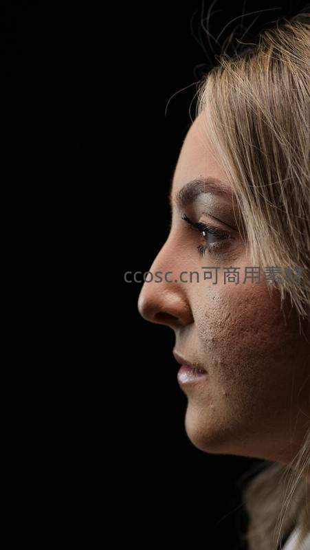 黑色背景下,女性侧脸被柔和光线勾勒出精致轮廓,皮肤纹理清晰可见,营造出一种神秘、静谧且富有艺术感的视觉氛围。