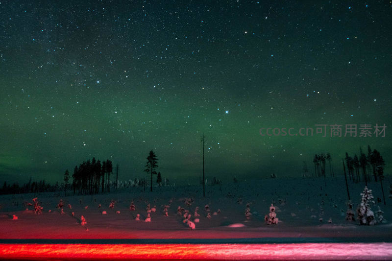 广袤雪原上,绿色极光与满天繁星交相辉映,前景红色光带增添暖意,营造出童话般的冬夜奇景。