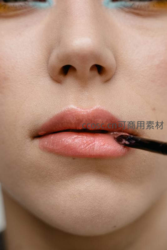 专业化妆师用刷头精准涂抹唇釉,捕捉色彩晕染的瞬间,展现美妆过程中的艺术感与专注力。