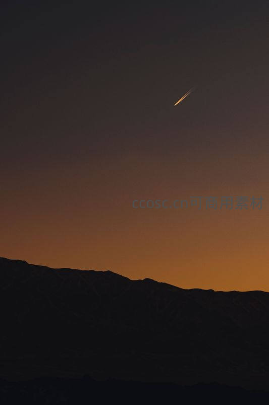 在橙红色的黄昏天幕下,一颗明亮的彗星拖着长尾划过山峦剪影,留下转瞬即逝的宇宙奇观。