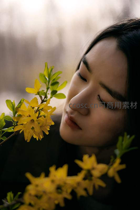 一位女子闭目轻嗅枝头盛开的黄色迎春花,阳光洒落面颊,画面温馨治愈,捕捉春日里最恬静美好的瞬间。