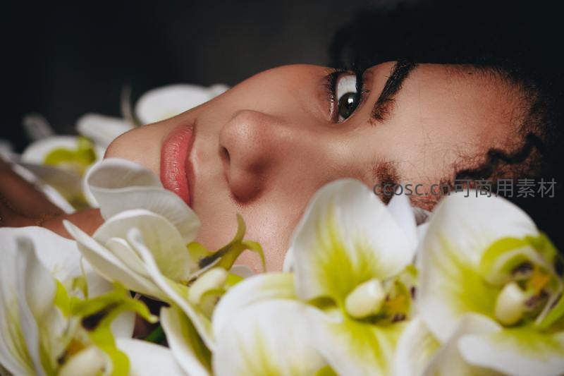 女子侧卧于洁白兰花丛中,眼神温柔宁静,花瓣轻触面颊,营造出梦幻而诗意的视觉氛围。