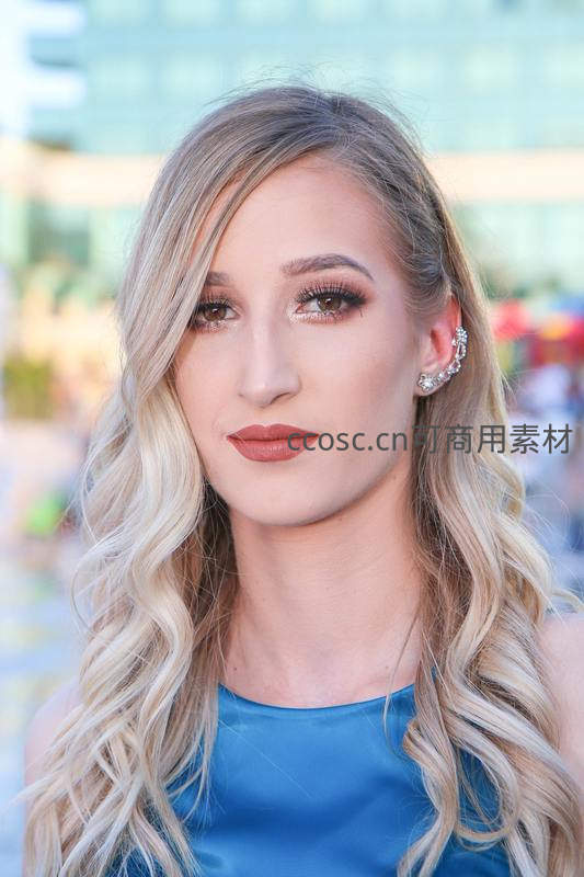 一位拥有金色波浪长发和精致妆容的女子,身穿亮蓝色无袖礼服,佩戴闪亮耳饰,面带温柔微笑,背景是模糊的城市街景,尽显都市优雅气质。