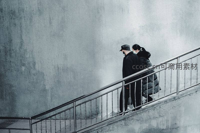 一对戴着口罩的行人在冰冷的灰色混凝土楼梯上缓步前行,背景墙面斑驳,映射出疫情时代城市生活的疏离与坚韧。
