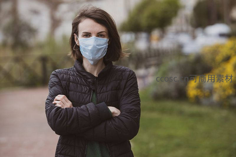 一位身着黑色外套的女子在公园小径上佩戴医用口罩,双臂交叉于胸前,背景是模糊的绿植与黄花,传递出日常防护与宁静氛围。