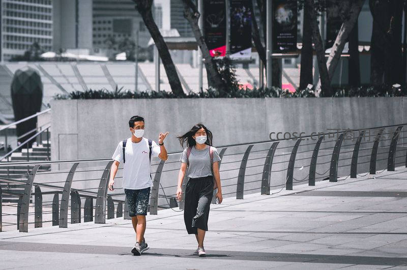 一对年轻情侣佩戴口罩,在现代化的城市广场上并肩行走,男子挥手示意,展现了疫情下人们依然保持社交与城市活力的场景。