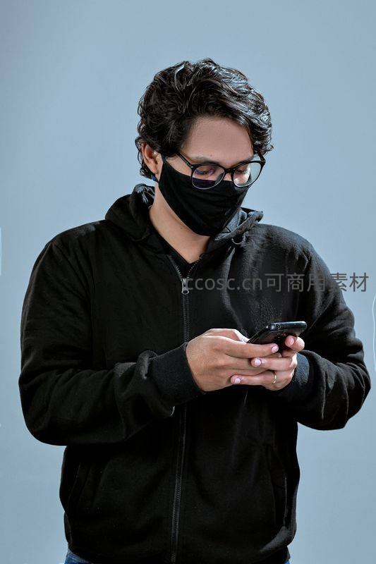 一位戴黑色口罩和眼镜的年轻人身穿黑色连帽衫,低头专注操作手机,展现了现代人在数字时代中的日常状态与沉浸感。