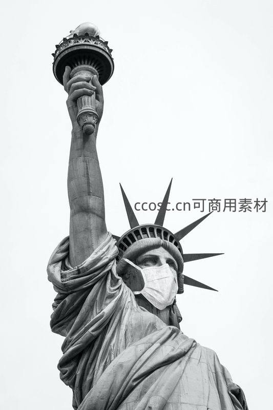 以黑白风格呈现的自由女神像头部特写,雕像佩戴白色医用口罩,寓意全球共同抗疫,赋予经典地标新的时代意义与人文关怀。