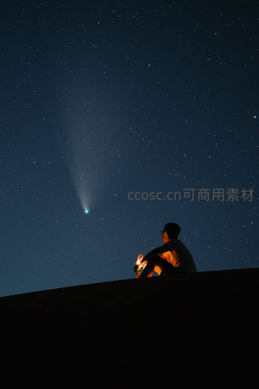 一人独坐山巅,手持微光,凝视着夜空中拖曳长尾的明亮彗星,繁星点点,天地辽阔,充满神秘与哲思。