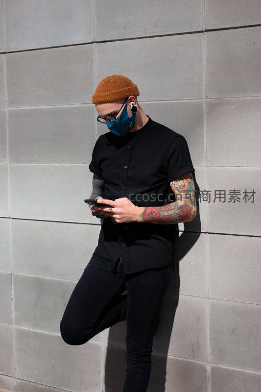 一位戴橙色毛线帽和蓝色口罩的潮流青年,靠在水泥墙边专注看手机,手臂上的彩色纹身十分抢眼,展现都市街头的个性风格。