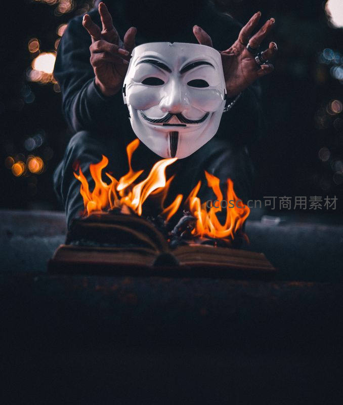 一只白色“V字仇杀队”面具被双手托举在一本熊熊燃烧的书本上方,背景虚化灯光闪烁,营造出神秘、反叛与知识毁灭的强烈视觉冲击。