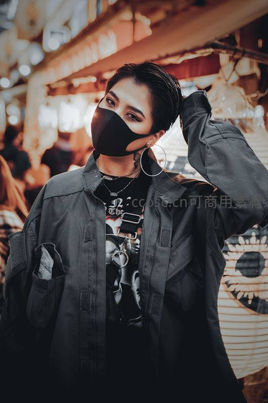 一位短发青年在热闹的夜市街头,身穿宽松工装外套,佩戴黑色口罩和大圈耳环,姿态自信地整理头发,背景是温暖的灯光与模糊人影。