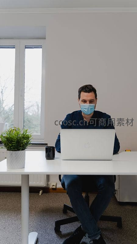 一名佩戴蓝色医用口罩的男子坐在白色办公桌前,专注操作银色笔记本电脑。桌上摆放绿植和黑色杯子,背景为明亮窗户与简约墙面,展现疫情期间远程办公场景。