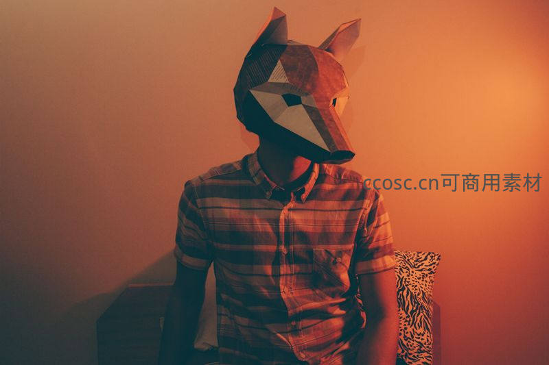 一位青年戴着手工制作的几何风格狐狸面具,身穿条纹衬衫,坐在温暖橙色灯光下的房间内,营造出神秘而富有艺术感的氛围。