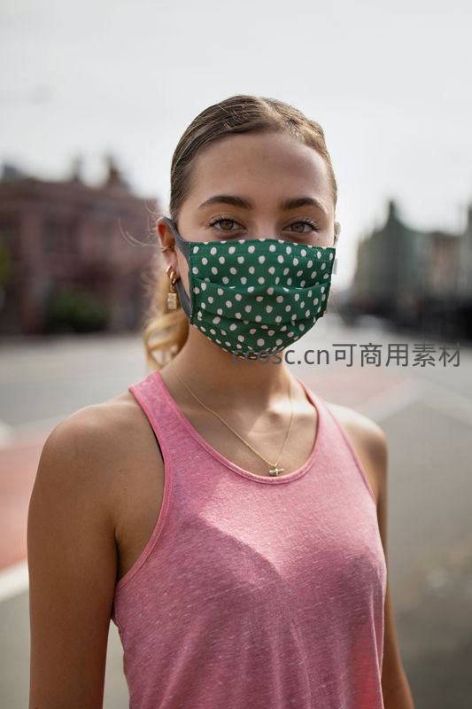 年轻女子在城市街道上佩戴绿底白点口罩,身穿粉色背心,阳光洒落,展现都市休闲与活力时尚风格。