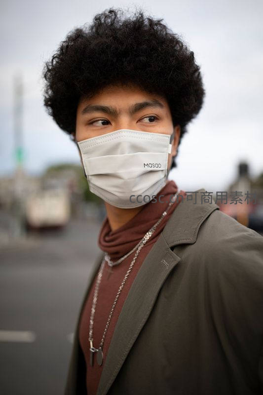 一位卷发青年佩戴印有MOSOO字样的白色口罩,身着时尚外套,眼神看向一侧,充满街头潮流感与个性魅力。