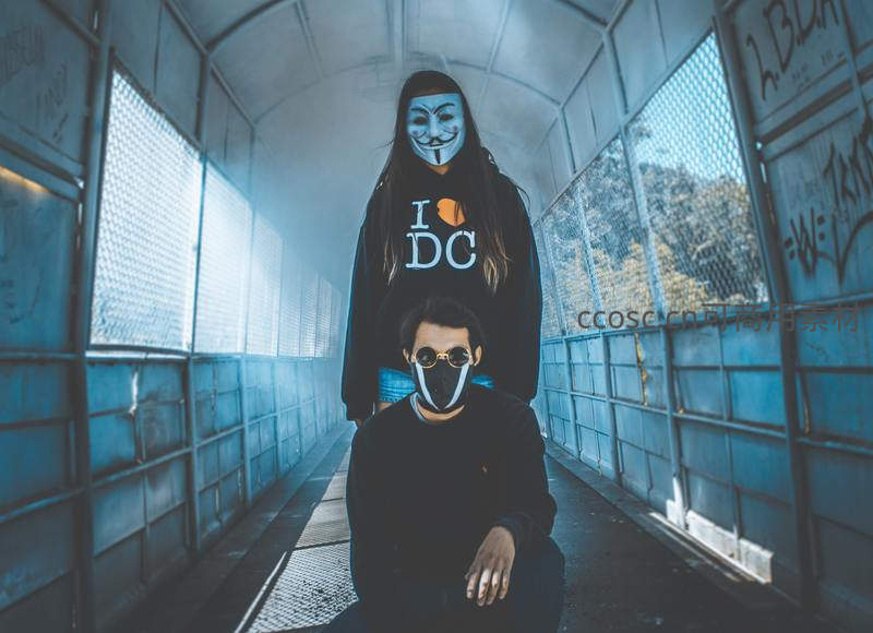 一对男女佩戴匿名者面具,在蓝光笼罩的隧道中形成强烈视觉对比,传达出神秘、反叛与亲密交织的独特情绪。