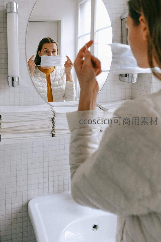 一位女士站在白色瓷砖浴室的圆形镜子前,正在调整口罩,准备外出,环境整洁明亮,充满生活气息。