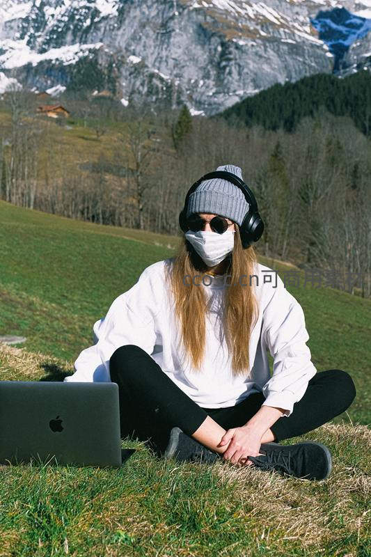 一位戴着口罩和针织帽的年轻女子,坐在绿草如茵的山坡上,使用笔记本电脑,背景是白雪皑皑的壮丽山脉,展现了现代生活与自然的融合。