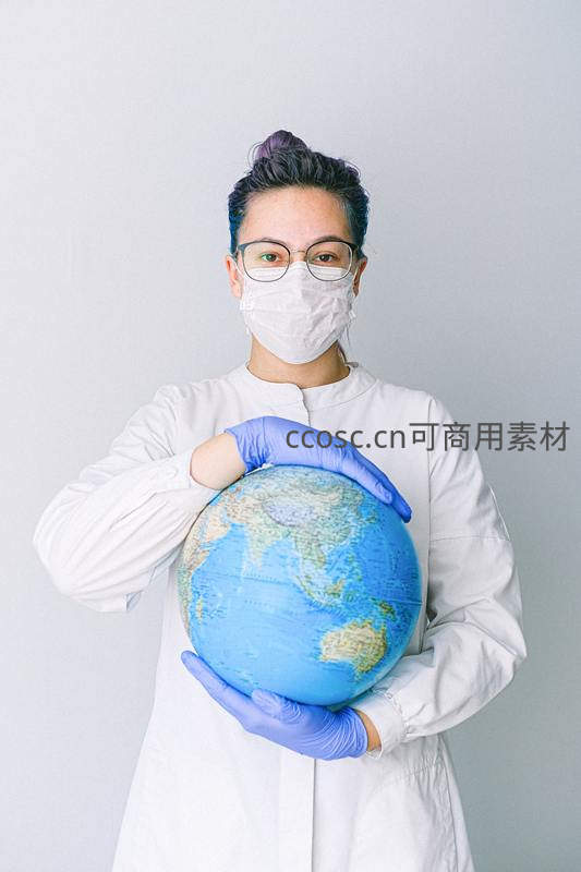 身穿白大褂、戴口罩和蓝色手套的医护人员双手环抱地球仪,寓意守护全球公共卫生安全,体现医者仁心与国际责任。