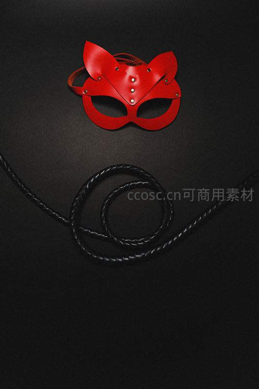 红色狐狸面具与黑色皮鞭静物