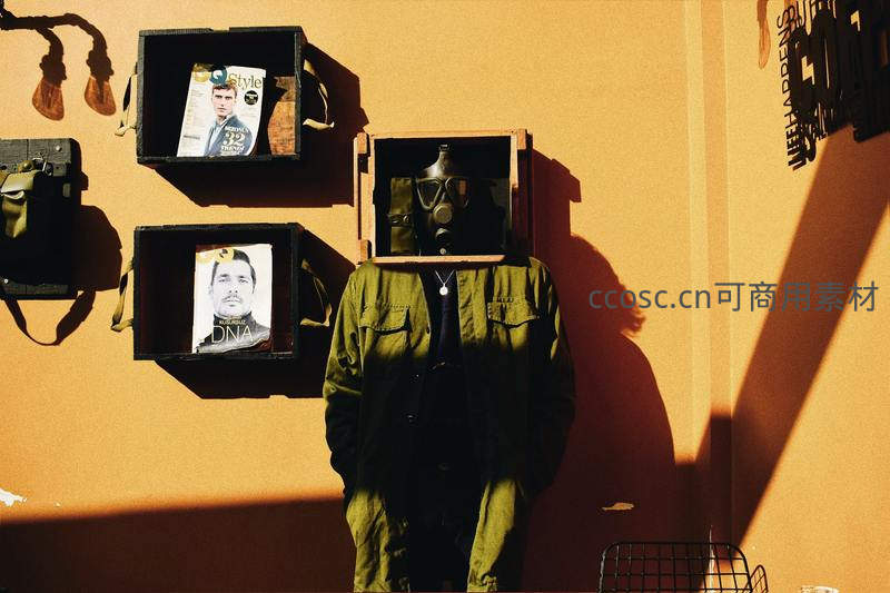 一个穿着军绿色外套的人头戴复古防毒面具,站立于橙黄色墙壁前,墙上悬挂装有时尚杂志的木箱,光影交错,充满艺术张力。