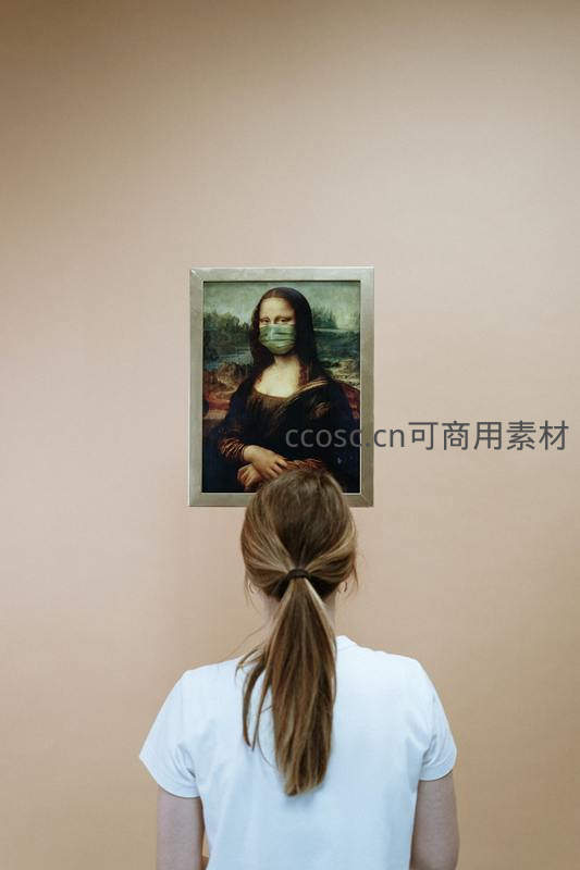 女子背影凝视戴口罩的蒙娜丽莎画像