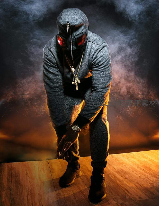 一位身穿灰色连帽卫衣、佩戴红色护目镜的神秘人物,在弥漫的烟雾和暖色灯光下俯身站立,颈间挂着十字架项链,整体造型充满未来感与街头潮流气息。