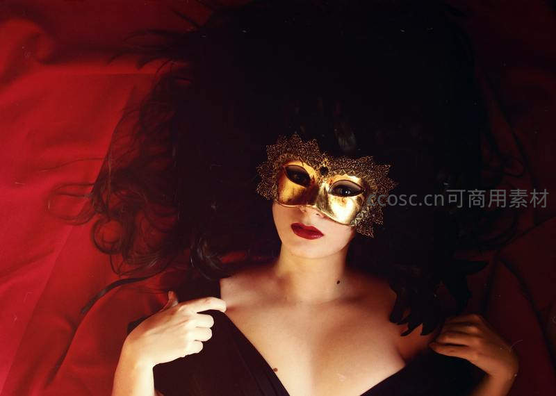一位女子躺在鲜红的绸缎上,佩戴着精致的金色威尼斯面具,浓密卷发散落四周,红唇微启,眼神迷离,营造出一种奢华、神秘且充满戏剧张力的艺术氛围。