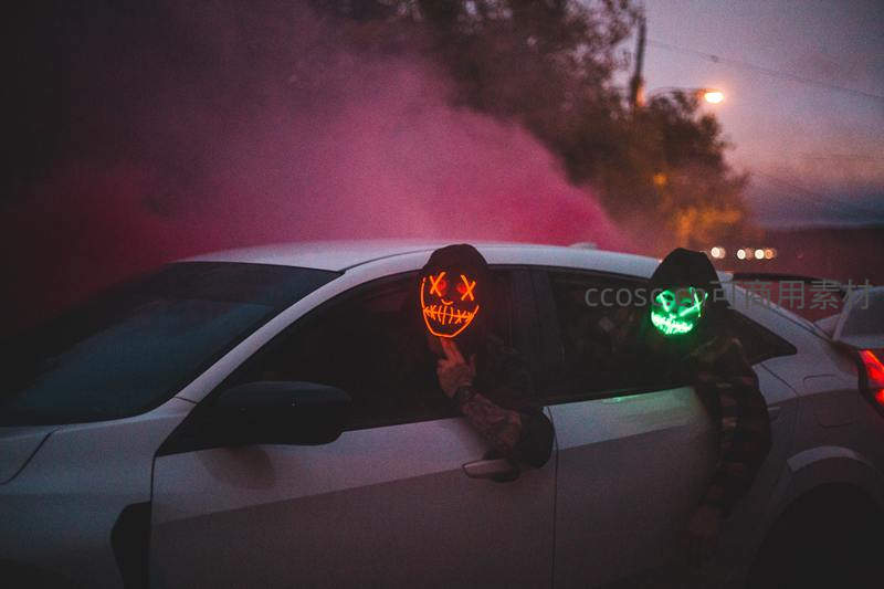 两名乘客从车窗探出身,戴着发光鬼脸面具,背景弥漫着粉色烟雾,夜色中充满叛逆与狂欢气息。