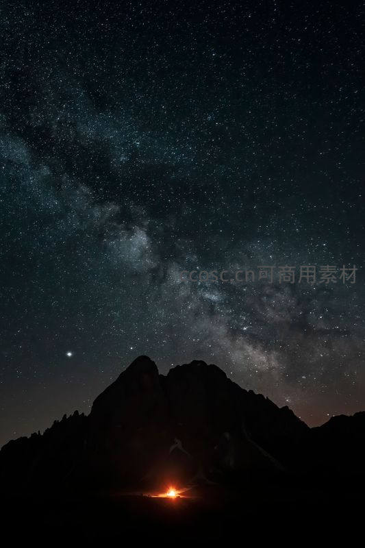 巍峨雪山剪影下,一簇温暖篝火静静燃烧,头顶是横贯天际的璀璨银河,冷峻与温暖在此刻完美交融。