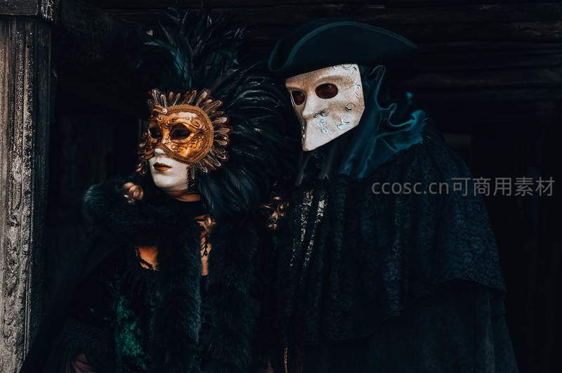一对身着华丽黑袍、佩戴精致羽毛面具的男女在幽暗背景中相依,营造出浓郁的哥特式浪漫与神秘氛围。