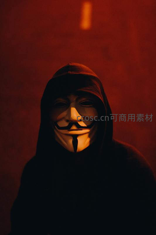 在深红色灯光映照下,一个身披黑色连帽衫的人静静伫立,脸上佩戴标志性的V字仇杀队面具,营造出神秘而紧张的氛围。