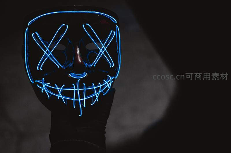 一只戴着蓝色霓虹灯勾勒出恐怖笑脸的面具在黑暗中格外醒目,线条闪烁,充满未来科技感与万圣节派对的惊悚氛围。