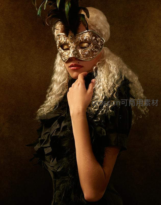 金发女子佩戴华丽的金色威尼斯面具,身着黑色羽毛礼服,手托下巴凝视远方,整体画面色调温暖,充满古典油画般的艺术美感与静谧气质。
