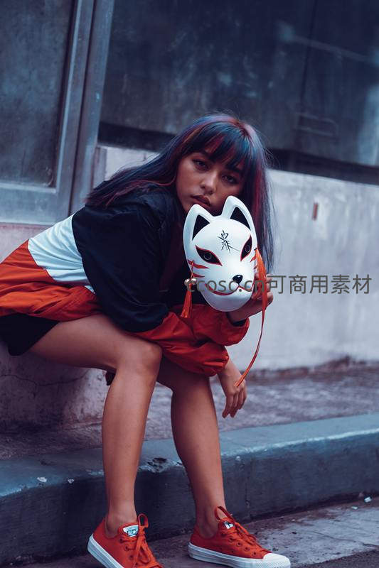 一位年轻女孩蹲在城市街角,怀抱着一个白色狐狸面具,身着红白相间的现代服饰,背景略显斑驳,呈现出都市与传统元素交融的独特视觉风格。