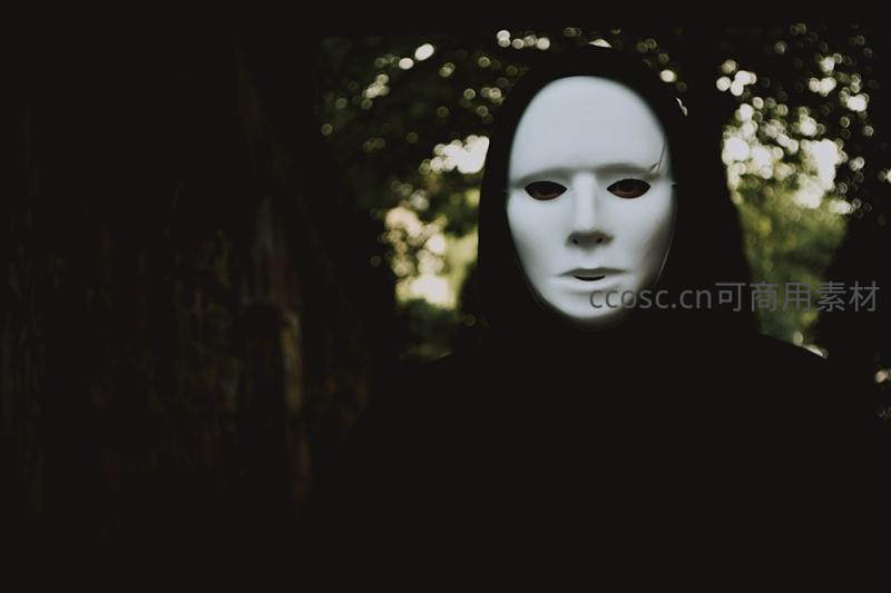 一个戴着纯白无表情面具的人物,身披黑袍,伫立在幽暗的树林背景前,营造出强烈的悬疑与神秘感。