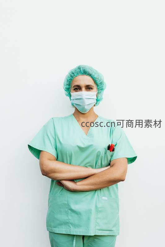 身穿绿色手术服、佩戴口罩和手术帽的女护士双臂交叉站立,眼神坚定,展现出医护人员的专业与担当。