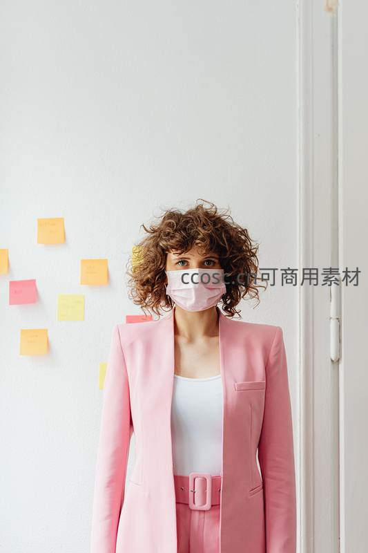 一位穿着粉色西装、戴着口罩的卷发女白领站在贴满彩色便利贴的墙前,体现现代职场女性的干练与活力。