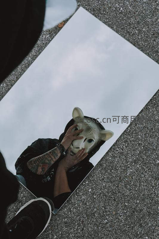 地面上放置的镜子映出一位戴白色羊头面具的人,双手轻抚面具,背景是灰白天空,营造超现实与自我凝视的艺术氛围。