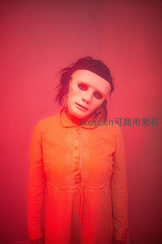 在浓郁红色灯光笼罩下,一位穿着橙色连衣裙、戴着白色面具的人物直视镜头,营造出令人不安的神秘与惊悚氛围。