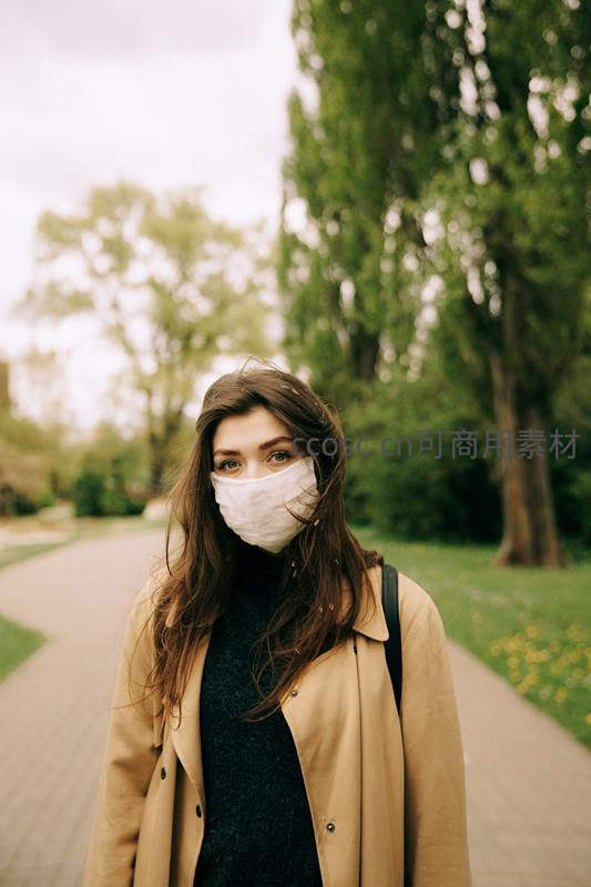 一位长发女子戴着白色口罩,在绿树成荫的公园小径上缓步前行,眼神深邃,流露出宁静与沉思的生活气息。