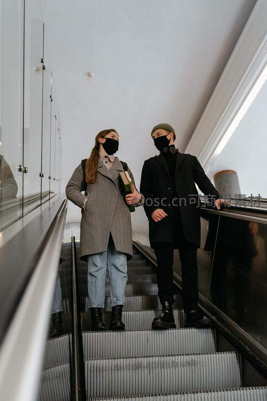 一对年轻情侣佩戴口罩并肩站在商场自动扶梯上,女子手捧书籍,男子戴着耳机,简约时尚的穿搭与明亮的现代空间共同描绘都市生活的宁静瞬间。
