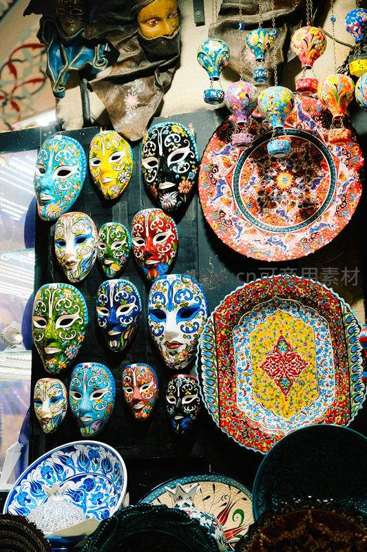 彩色威尼斯面具与陶盘,市集琳琅满目
