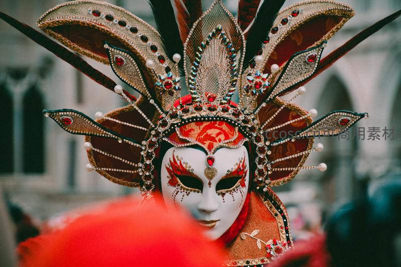 精致的威尼斯狂欢节面具特写,白底红金花纹配羽毛与珠饰,细节奢华夺目,展现传统节庆服饰的艺术美感与神秘氛围。