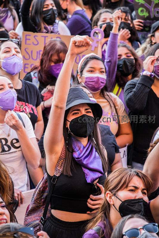 一群佩戴紫色口罩的女性在街头集会,中心人物高举拳头,眼神坚定,背景标语与人群传递出强烈的性别平等与社会抗争精神。