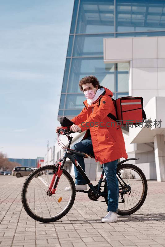 一名身穿鲜艳橙色外套、背着保温箱的外卖骑手正跨坐在山地车上,背景是现代化玻璃幕墙建筑,展现出都市物流的日常景象。