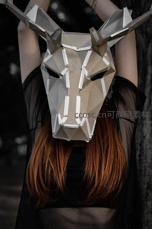 一位红发女子佩戴着精巧的多边形鹿头面具,身着黑色薄纱,在幽暗背景中营造出强烈的视觉冲击与神秘氛围。