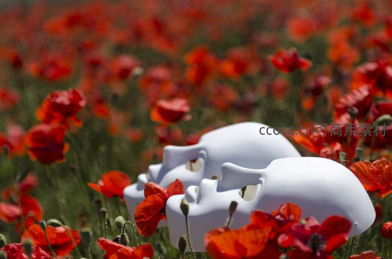 两具洁白的骷髅面具安卧于一片炽烈的红色罂粟花海中,形成生与死、美丽与哀伤的强烈视觉隐喻和艺术表达。